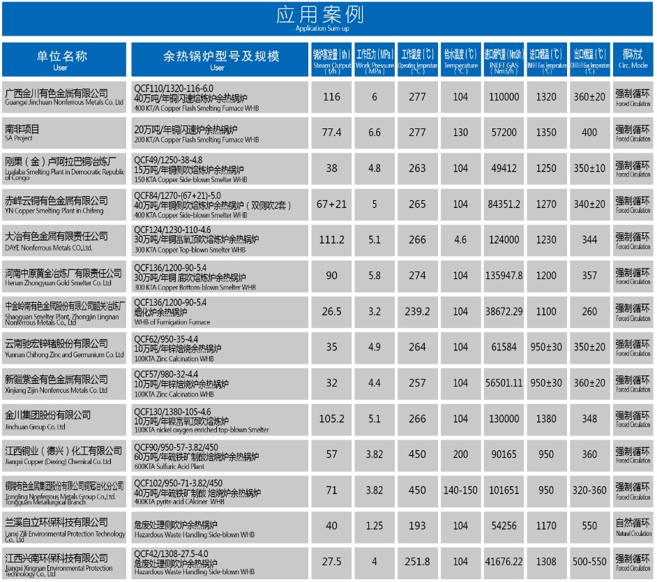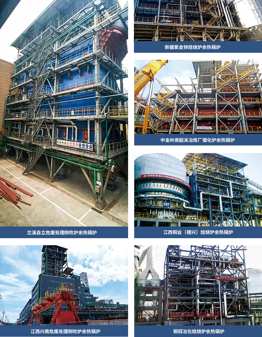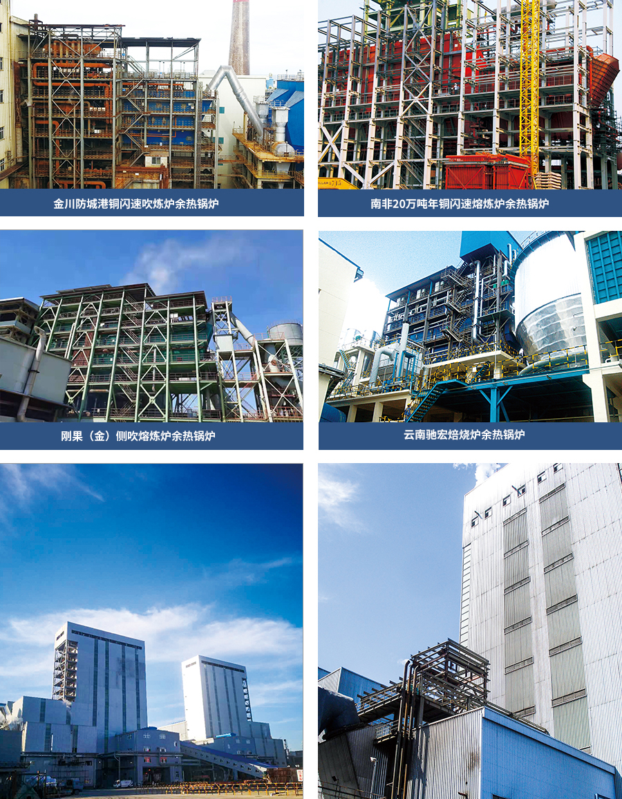 由我公司自主設計、制造、安裝的有色冶余熱鍋爐服務于國內外各大有色冶煉企業(yè),如金川集團、紫金礦業(yè)、江西銅業(yè)、中國銅業(yè)、云南錫業(yè)、馳宏鋅鍺等,有色市場占有率90%以上。我們的研發(fā)團隊經(jīng)過多年潛心研究,形成的產(chǎn)品有: