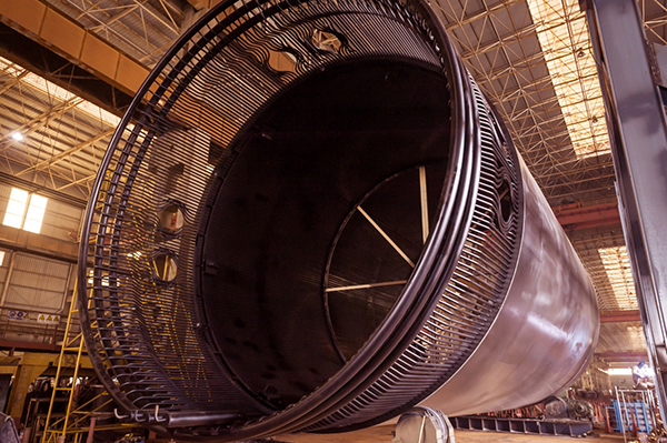 公司承制的余熱排出系統(tǒng)水冷壁設(shè)備系高溫氣冷堆核電站中第一大件,為國內(nèi)乃至國際首臺,也即將成為高溫氣冷堆示范工程第一個到貨的超大件。余熱排出系統(tǒng)水冷壁主要用于吸收反應(yīng)堆壓力容器表面釋放的熱量,并通過水冷壁內(nèi)的冷卻水將熱量帶出反應(yīng)堆艙室,保證反應(yīng)堆壓力容器與混凝土艙室溫度不超過規(guī)定限值。整個水冷壁包括水冷膜式壁、外支撐圈、隔熱板、冷卻水管、聯(lián)箱、出入口主管、錐形支撐底座等,其安裝方式為環(huán)繞反應(yīng)堆壓力容器垂直放置。該設(shè)備外形尺寸φ8726×19096mm,尺寸大、運輸超限、安裝間隙小、精度要求高,對制造成形、組裝、焊接、無損檢測、水壓試驗、氣壓試驗及搬運吊裝運輸都帶來了很大困難。尤其是制造尺寸超限,設(shè)備整體組裝只能在江邊碼頭進行,寒冬臘月,江風(fēng)刺骨;冷冽的寒風(fēng)中,項目制造管理團隊始終保持飽滿的工作熱情,面對困難迎難而上,攻堅克難。針對本設(shè)備結(jié)構(gòu)的特殊性,結(jié)合現(xiàn)有設(shè)備、工藝裝配、檢測手段、質(zhì)量管理要求設(shè)計了專用的水冷壁內(nèi)外支撐工裝、分片膜式壁吊運工裝、水冷壁整體運輸工裝、水冷壁整體垂直吊裝工裝等,編制了完整的操作規(guī)程、工藝執(zhí)行文件、質(zhì)量計劃、焊接工藝、檢驗方案等,為產(chǎn)品質(zhì)量提供了有力的支撐和保證。最終,產(chǎn)品制造質(zhì)量獲得了業(yè)主和設(shè)計院的一致好評,順利通過驗收。