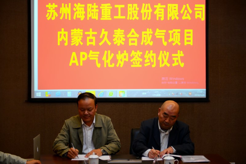 2018年12月6日下午,在海陸重工會(huì)議室,空氣化工產(chǎn)品(中國(guó))投資有限公司與蘇州海陸重工股份有限公司,舉行久泰合成氣項(xiàng)目AP氣化爐簽約儀式,AP公司采購(gòu)總監(jiān)戴曉輝與海陸重工鍋爐事業(yè)部總經(jīng)理陳吉強(qiáng)分別在簽約書(shū)上簽字